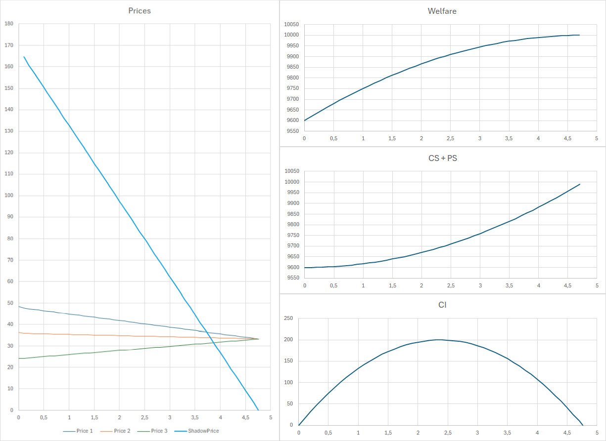 It is quite interesting that when RAM = 0, CI becomes zero, but we still have flows between zones with price differences. The only logical conclusion is thus that CI emerging from different border flows cancels. And this is exactly what happens. Links between Zone 0 and Zone 1, and between Zone 1 and Zone 2 gets a CI value of 48 and -48 respectively, while flow from Zone 2 to Zone 0 is zero and consequently its CI is zero.