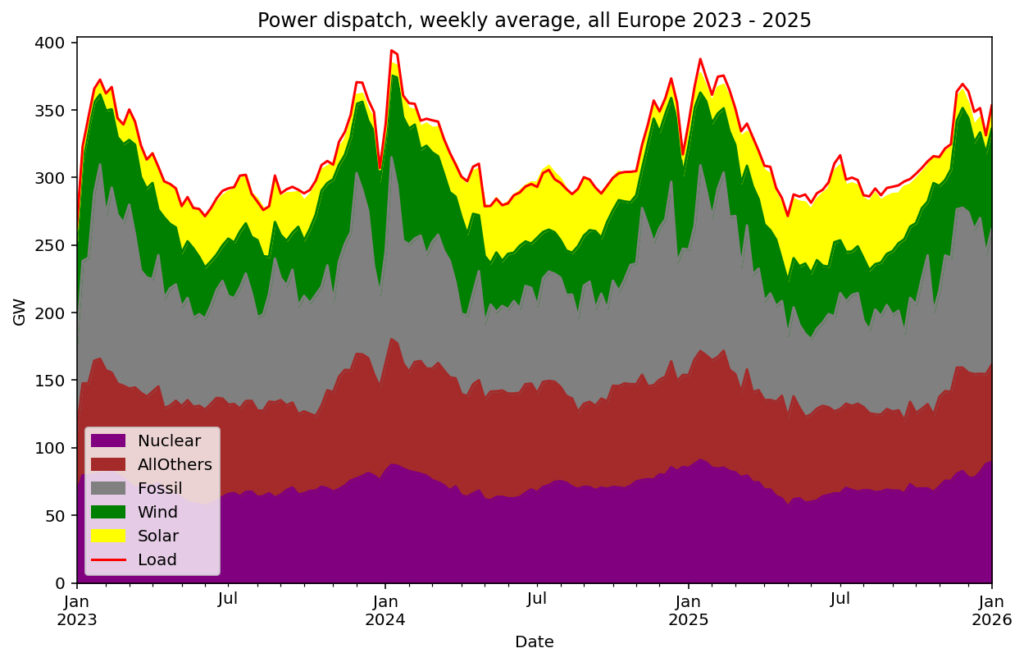 In 2025, Europe consumed about 770 TWh of electricity produced from fossil fuel sources (excluding “behind-the-meter” generation). The associated CO₂ emissions are on the order of 600 Mt per year. While this is less than 2% of global emissions, it is clearly desirable to minimize – or completely eliminate – this type of power production.