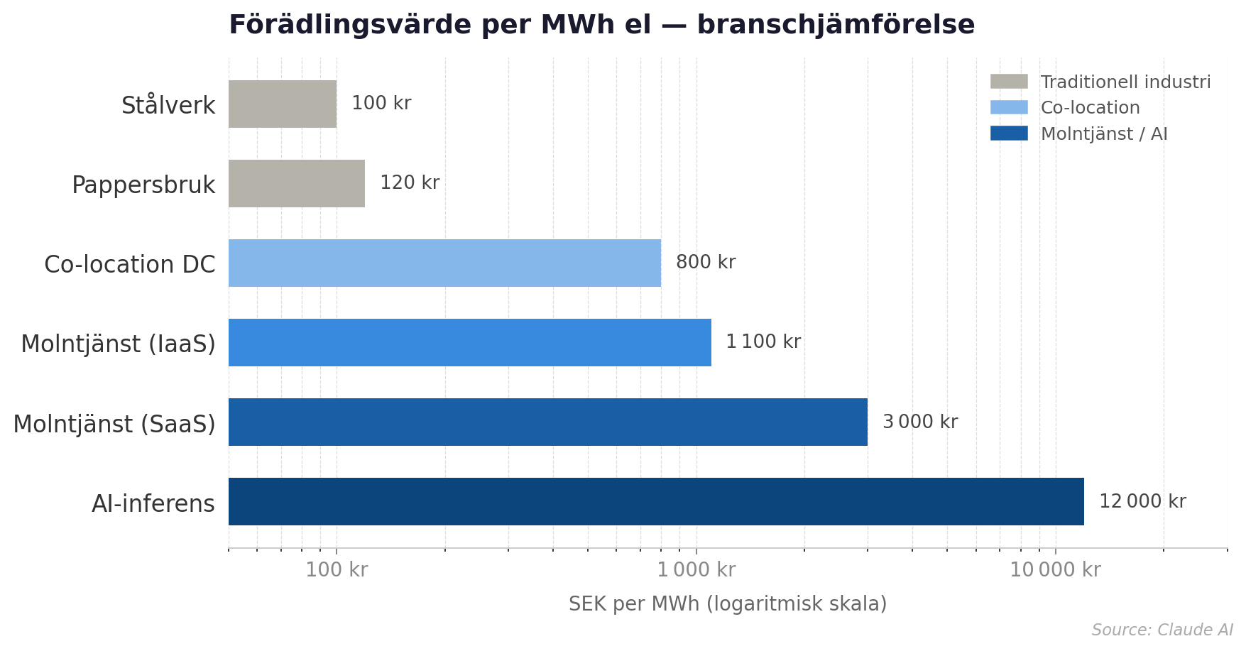 Förädlingsvärdet i datacenter är anmärkningsvärt högt relativt energiinsatsen. Ett stålverk skapar ungefär 50 – 150 kronor i ekonomiskt värde per MWh el det förbrukar. En molntjänst skapar 500 – 3 000 kronor per MWh. En AI-infrastrukturoperatör kan skapa fem till tio gånger mer. Det är inte en marginell skillnad — det är storleksordningars skillnad.