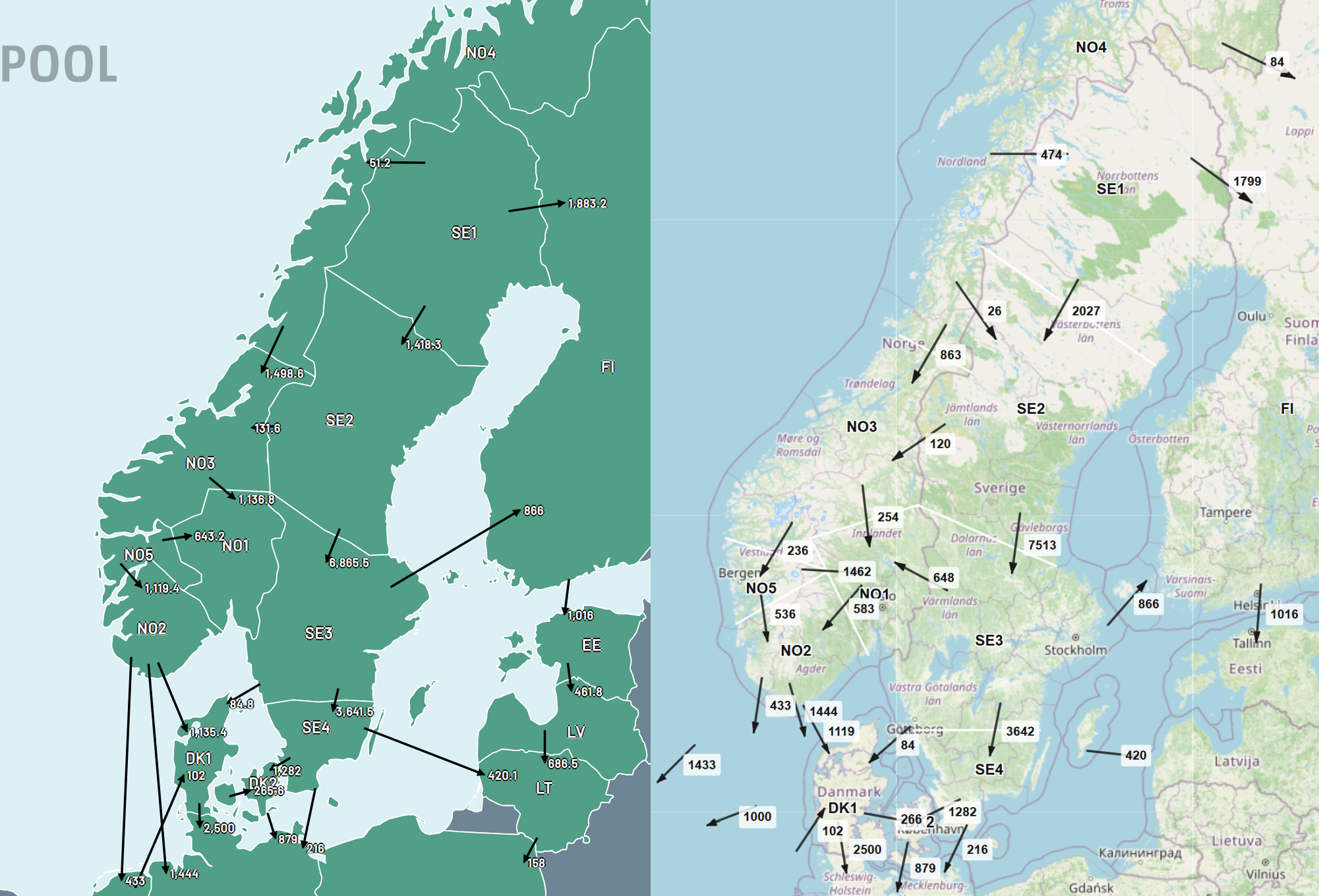 Most prominent is the difference between the Swedish/Norwegian flows. In NordPools map there is no flow from SE3 to NO1, while my map shows 648 MW. And a correspondingly lower flow over SE2->SE3 in the map of NordPool vs my map. It is clear that the North-South flow in Norway is limited and that part of this flows is transiting through Sweden.